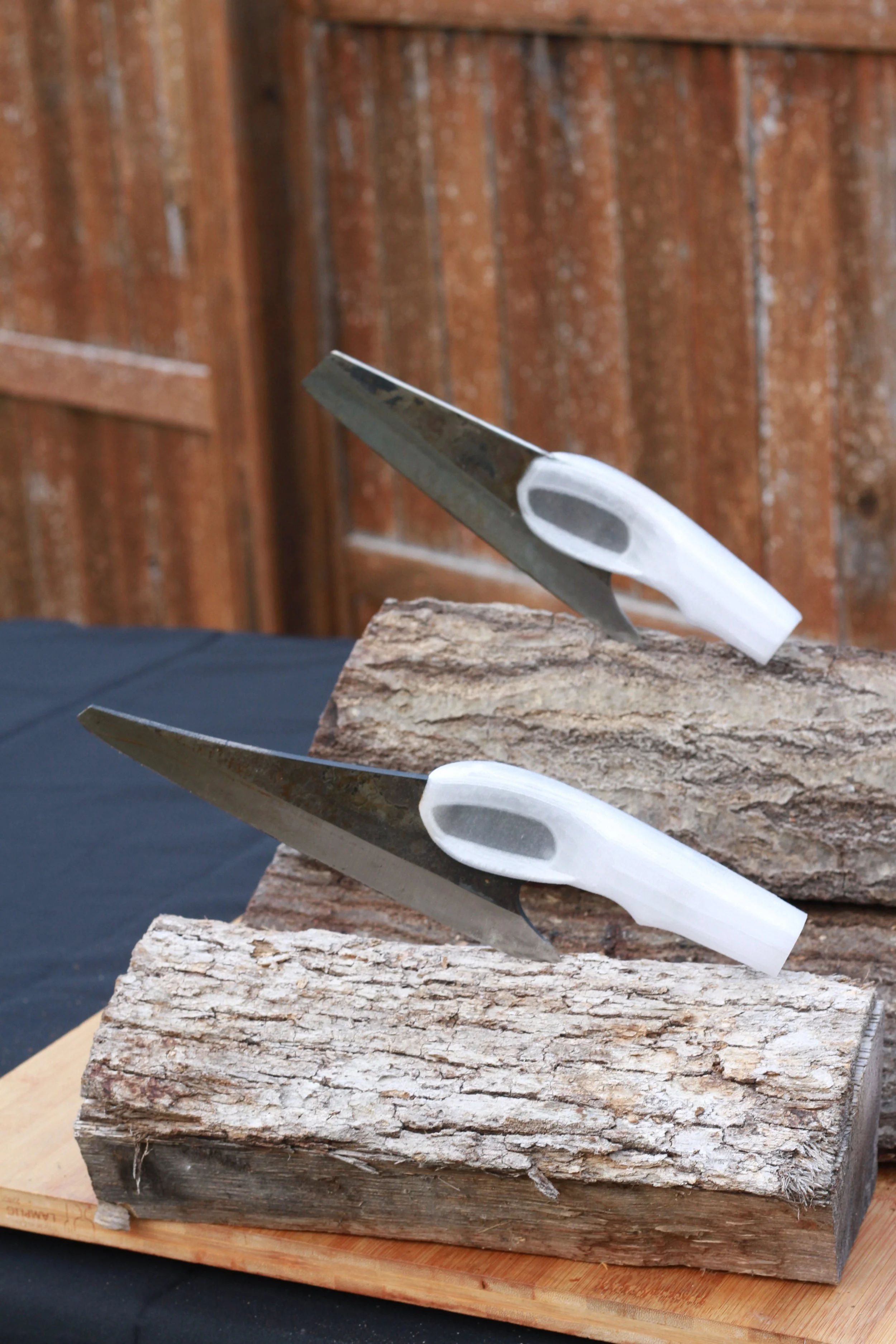 There are two styles. The long and pointed one for filleting, slicing and finer work. The shorter more stubby style is best for chopping and meat prep. Both have the custom handle with thumb and four finger slots for a firm and comfortable grip.